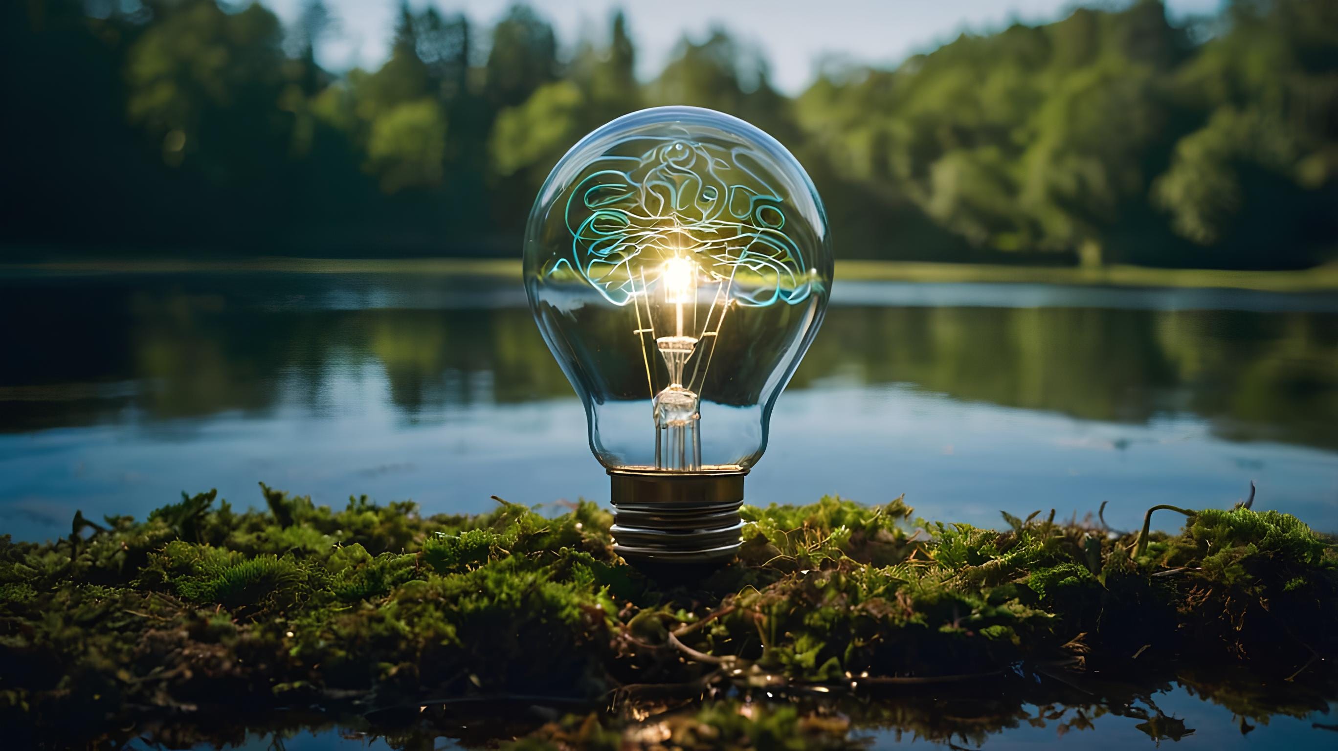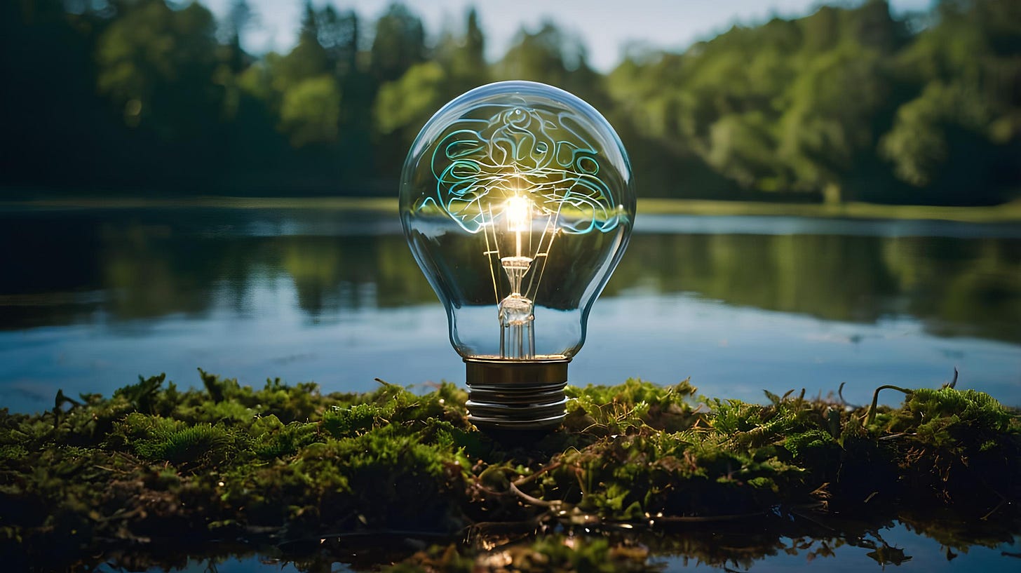 A serene lake reflects a peaceful sky. It's surrounded by lush green trees. An abstract brain swirls with chaotic thoughts. It represents the turmoil of overthinking. A glowing light bulb shines above, bright and clear. It symbolizes clarity and calm. This is the transformation you can create in your own mind with a 10-second mental reset.